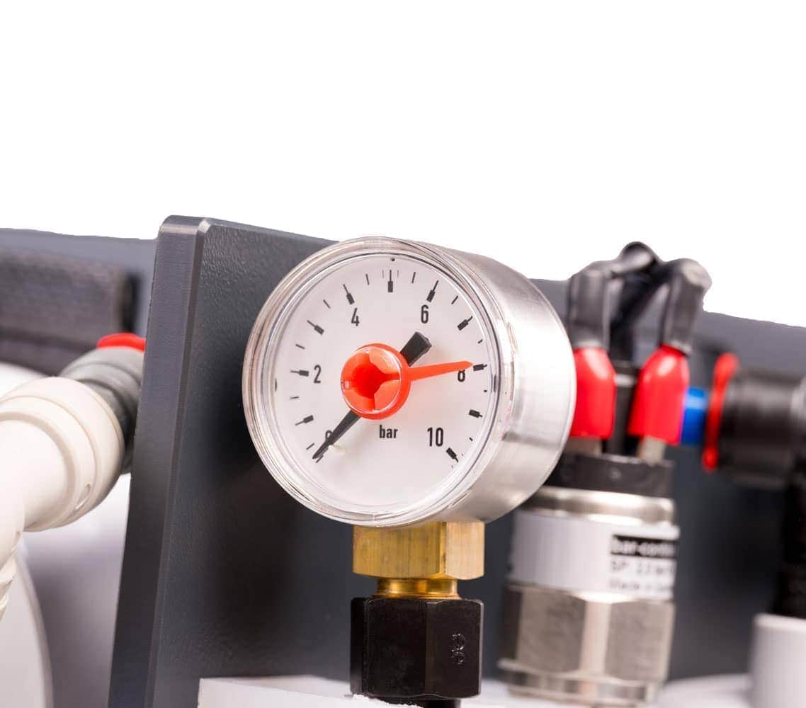 Das integrierte Manometer misst und zeigt permanent den anliegenden Wasserdruck an. Bei zu starkem Druckabfall geht die Anlage automatisch in den Störungsmodus. Dies verhindert ein Leerlaufen und die Beschädigung des wertvollen Edelstahlkompressors.