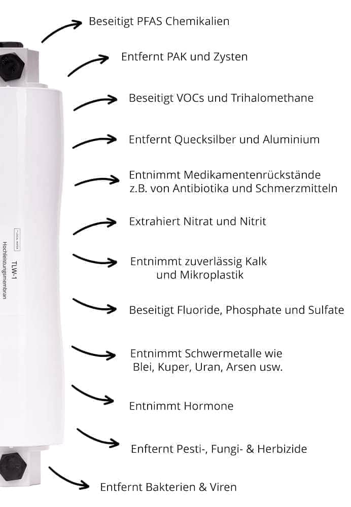 Apple produziert seine eigenen Chips und The Local Water seine eigenen Membranen. Diese ultrafeinen Membranen mit einer Porengröße von nur 0,0001 µm lassen fast nur Wassermoleküle passieren und halten nahezu alle anderen Substanzen zurück. Wir verwenden aus Gründen der Qualität und Qualitätssicherung nur unsere eigenentwickelten Membranen anstatt den günstigen Standard-Membranen aus Fernost.