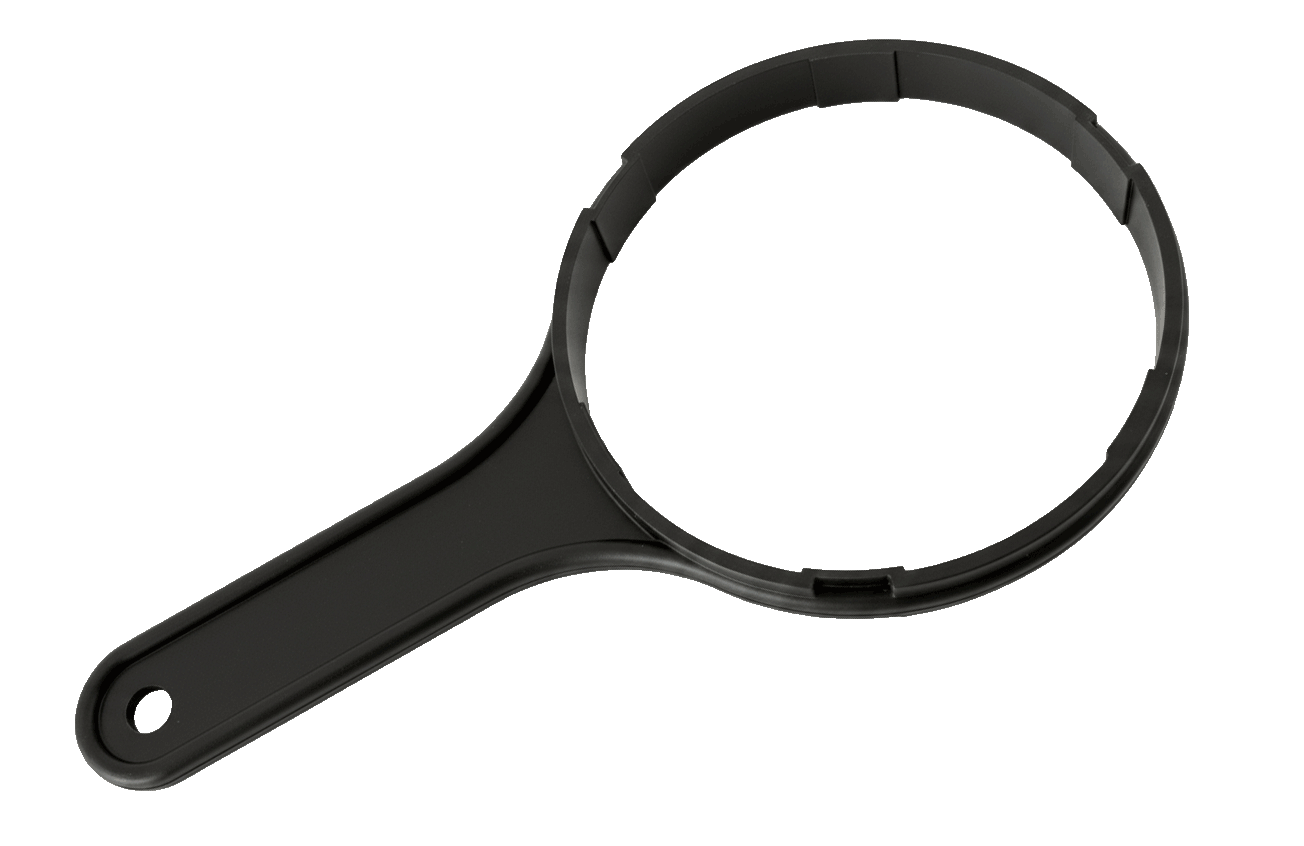 Montageschlüssel für unseren Untertischfilter Base mit dem durchsichtigem Filtergehäuse und schwarzem Kopfteil.