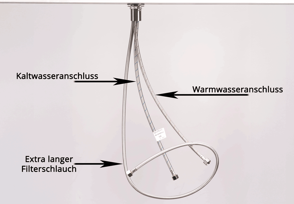 Die mitgelieferten Anschlussschläuche ermöglichen eine einfache und zuverlässige Verbindung mit den vorhandenen Wasseranschlüssen. Dank ihrer robusten Verarbeitung sind sie langlebig, druckbeständig und für den täglichen Einsatz in der Küche ausgelegt. Die klar gekennzeichneten Leitungen sorgen für eine übersichtliche Installation und erleichtern den fachgerechten Anschluss von Warm-, Kalt- und Filterwasser. Durch ihre flexible Ausführung lassen sich die Schläuche auch bei begrenztem Platz unter der Spüle komfortabel verlegen.