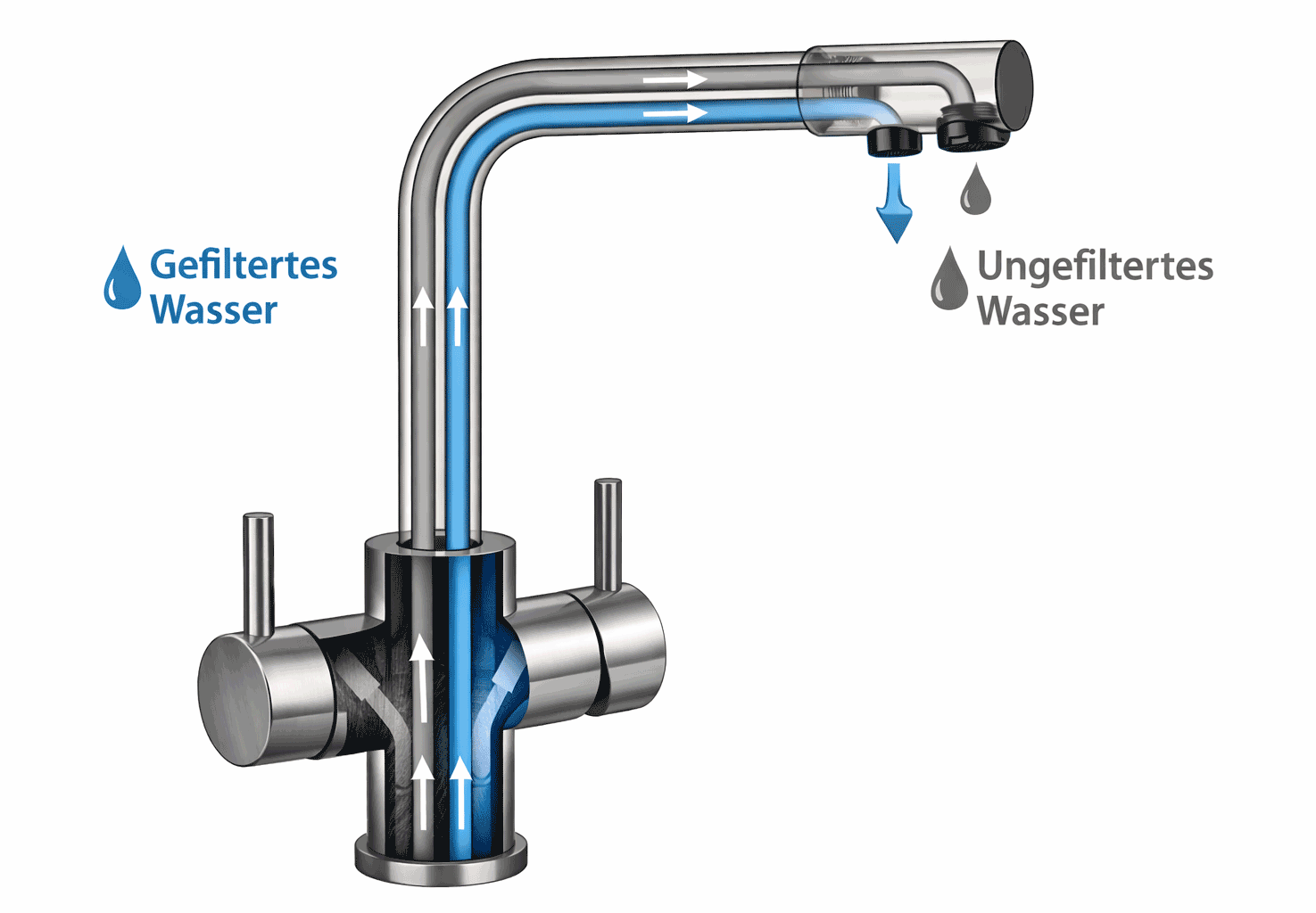 In der Armatur laufen Leitungswasser und gefiltertes Wasser über zwei getrennte Wasserwege. Dadurch gibt es keine Vermischung – dein Trinkwasser bleibt klar, hygienisch und geschmacklich unverändert.