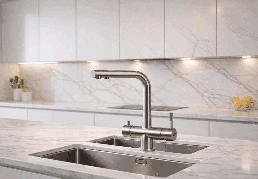 Für den Alltag liefert die Armatur wie gewohnt Warm- und Kaltwasser. Zusätzlich steht dir gefiltertes Trinkwasser über einen separaten dritten Wasserweg zur Verfügung, sauber getrennt und bequem aus einem Hahn.